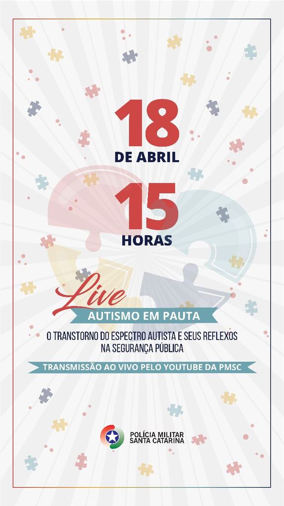 A Polícia Militar de Santa Catarina realiza na próxima terça-feira, dia 18, às 15h, a transmissão de uma palestra ao vivo (LIVE) sobre o Autismo. O tema a ser debatido será “O Transtorno do Espectro Autista e seus Reflexos na Segurança Pública”. A live será transmitida pelo canal do YouTube da PMSC (@pmscoficial) diretamente da sede do comando-geral, em Florianópolis.