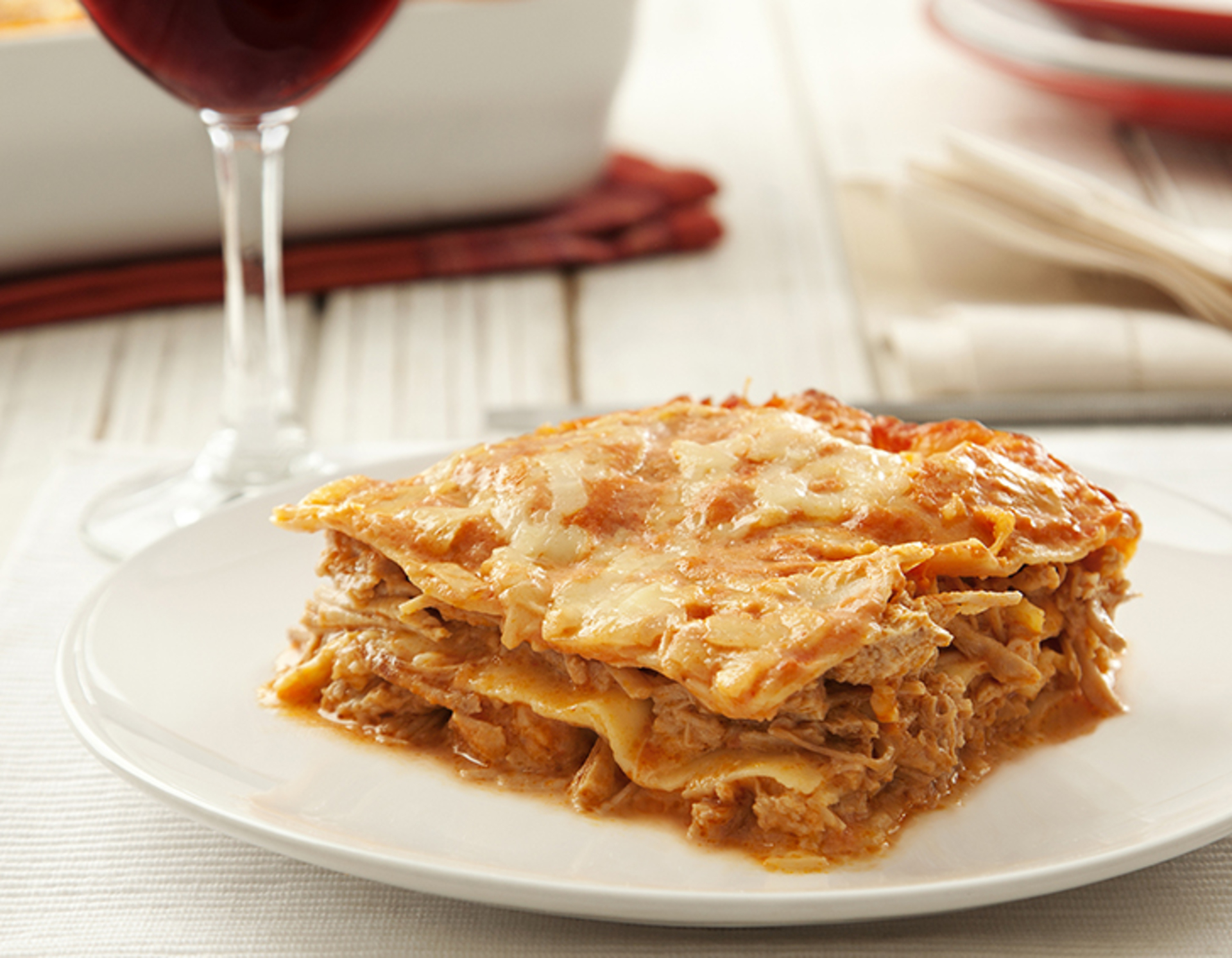 Em uma assadeira grande (27cm x 42cm x 7cm de altura) espalhe um pouco do molho rosé. Intercale camadas de massa, molho rosé, pernil e provolone ralado, sendo a última camada de provolone. Cubra com papel-alumínio e leve ao forno médio (180ºC), preaquecido, por 40 minutos. Retire o papel-alumínio e deixe por 10 minutos no forno para gratinar.