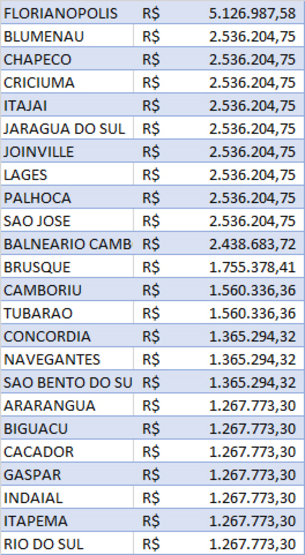 Os 295 municípios de Santa Catarina começaram a receber R$ 162,3 milhões, referentes ao Fundo de Participação dos Municípios (FPM), que sofreu perdas por conta de medidas tomadas no governo passado, como a suspensão da cobrança de tributos sobre os combustíveis, que segurou os preços para o consumidor. A capital, Florianópolis, é a que receberá a maior fatia, com R$ 5,1 milhões. Blumenau é a segunda com R$ 2.536;204,75. Outros oito municípios estão na faixa de R$ 2,5 milhões: Chapecó, Criciúma, Itajaí, Jaraguá do Sul, Joinville, Lages, Palhoça e São José.