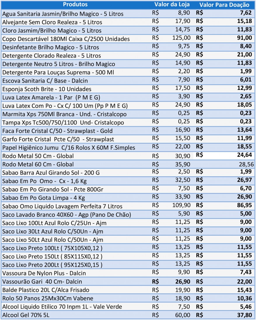 Por iniciativa da Toy Box, empresa com sede no Gaspar Mirim, dois caminhões carregados de donativos tiveram como destino os municípios de Igrejinha, Três Coroas e Taquaras. A campanha teve ainda a participação do Rotary Club e de outras empresas. Outra mobilização partiu da Rádio 89Fm, juntamente com a OralUnic. A campanha encerrou nesta quarta-feira e a agora os donativos vão seguir para o Rio Grande do Sul. A Conferência Vicentina, ao lado da Igreja Matriz São Pedro Apóstolo também está recebendo doações. Acig, Ampe e CDL também realizaram campanha que finalizou na sexta-feira, dia 10. Para quem for doar, as orientações são amarrar calçados, etiquetar caixas indicando o que estão nas sacolas e caixas. Para quem deseja contribuir, mas não tem itens para doar, a Família Rotária disponibiliza a chave unificada: [email protected]. Outra iniciativa partiu da Rabi Distribuidora, no bairro Santa Terezinha. A empresa reduziu o preço de alguns produtos, como sacos de lixo, papel higiênico, luvas, desinfetante, água sanitária, alvejante e álcool. Os produtos podem ser comprados e doados para as campanhas. Confira os preços, abaixo.
