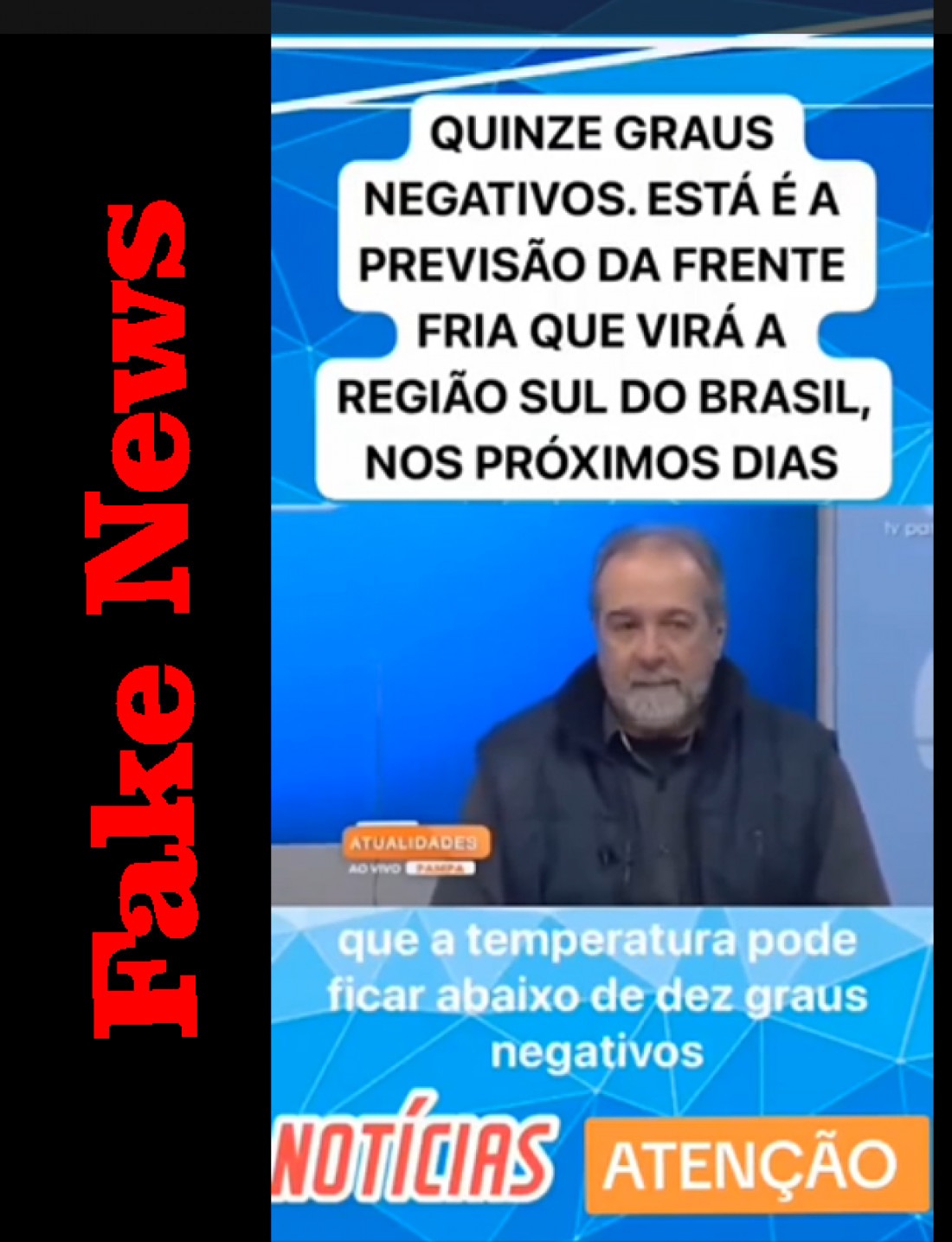 É falsa a informação que uma onda de frio extremo deve chegar ao sul do Brasil nos próximos dias. O vídeo, que circula nas redes sociais tendo como pano de fundo um canal de TV do Rio Grande do Sul, afirma que as temperaturas podem chegar a -15°C. A notícia, compartilhada por mais de 35,7 mil internautas, é de 23 de julho de 2021 e usa como fonte autoridades norte-americanas e canadenses. Nada é verdadeiro. O vídeo chegou a ser desmentido ainda em 2021 pelo Instituto Nacional de Meteorologia (Inmet),porém, voltou a circular com força nas redes sociais nas últimas semanas, acrescido da frase “Frio extremo pode chegar no Brasil e nos EUA [de] 2024 em diante”.