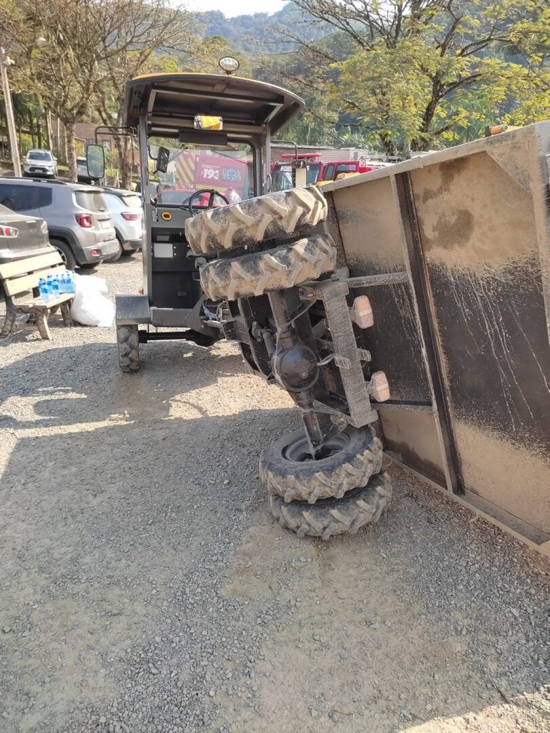 O incidente ocorreu quando o trator, que puxava uma carretinha com 10 pessoas, incluindo adultos e crianças, tombou na área interna do hotel (Fotos: CBMSC )
