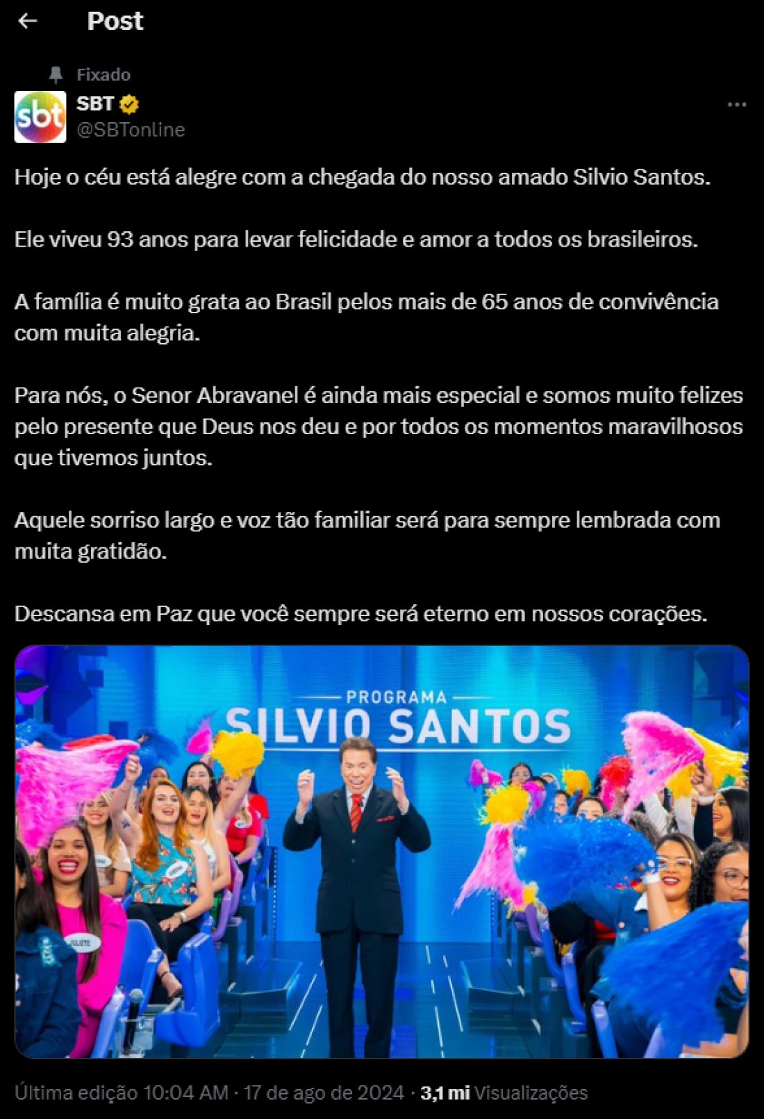 O SBT se manifestou nas redes sociais sobre a morte do apresentador e dono da emissora, Silvio Santos. O apresentador morreu na madrugada deste sábado, dia 17, aos 93 anos, no Hospital Albert Eistein, em São Paulo. Silvio havia contraído o vírus H1N1.