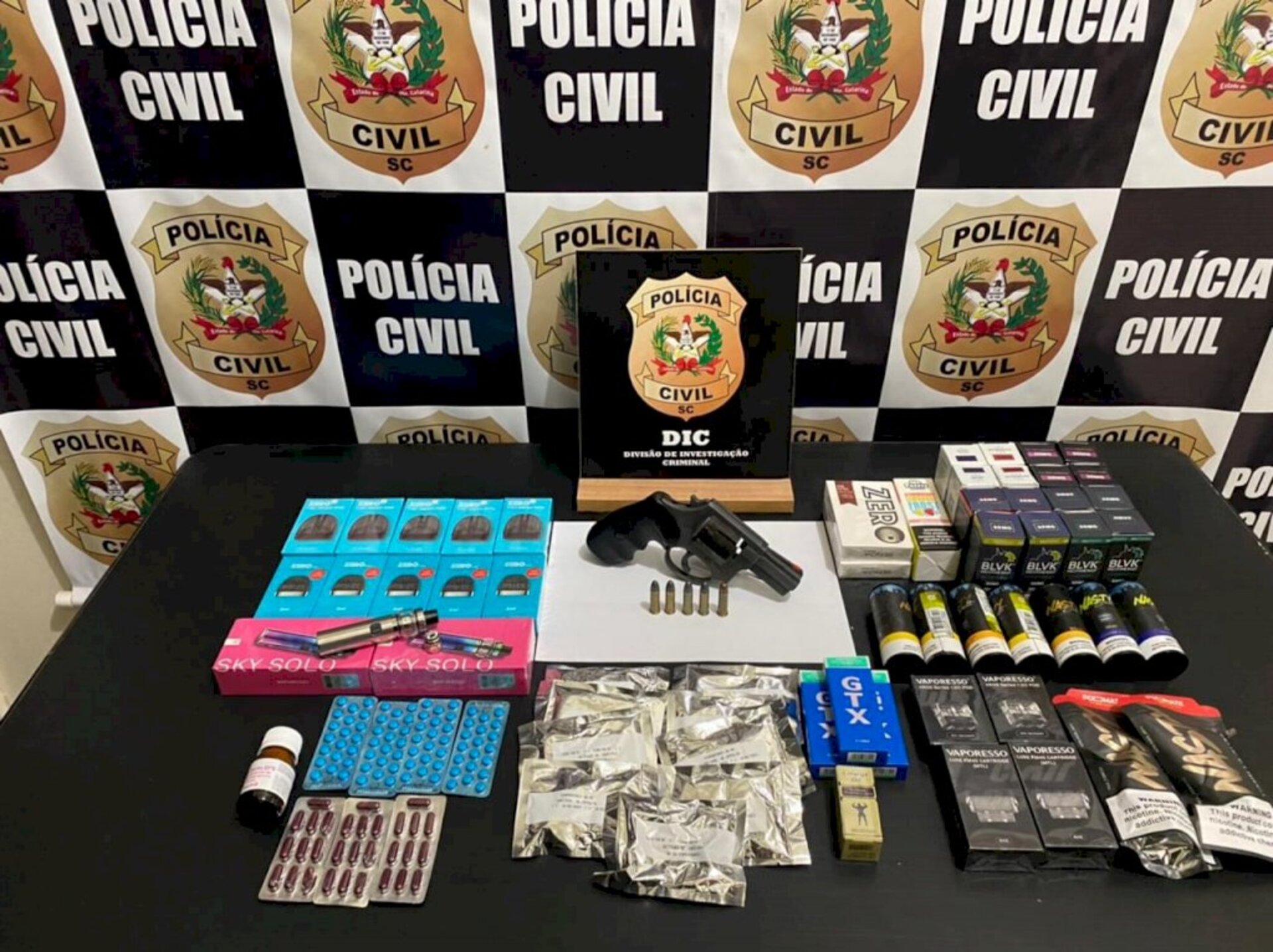 Na madrugada de domingo, os policiais civis da DIC/PCSC montaram barreira na rua Dr. Pedro Zimmermann (SC-108) à espera da passagem do investigado. Assim que o veículo foi identificado, os policiais fizeram a abordagem. Além do investigado, havia mais um condutor. Em buscas pessoais, os policiais civis localizaram um revólver municiado de origem estrangeira na cintura do investigado. Já sede da DIC/PCSC de Blumenau, para onde os suspeitos foram levados, os policiais localizaram dentro de uma caixa de som medicamentos sem registro na Agência Nacional de Vigilância Sanitária, além de cigarros eletrônicos e insumos igualmente proibidos no país (Resolução de Diretoria Colegiada da Anvisa: RDC nº 46, de 28 de agosto de 2009).
