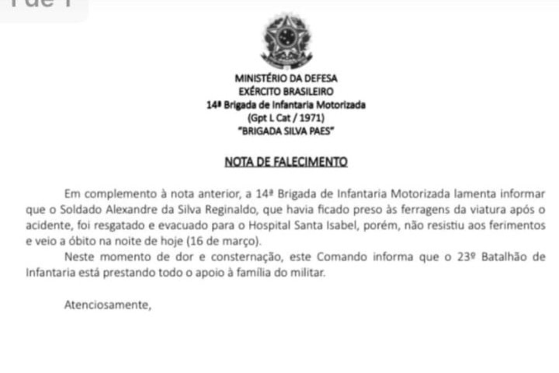 Em nota divulgada pelo 14ª Brigada de Infantaria Motorizada, o comando do 23° BI destaca que "neste momento de dor e consternação, está prestando todo o apoio à família do militar".