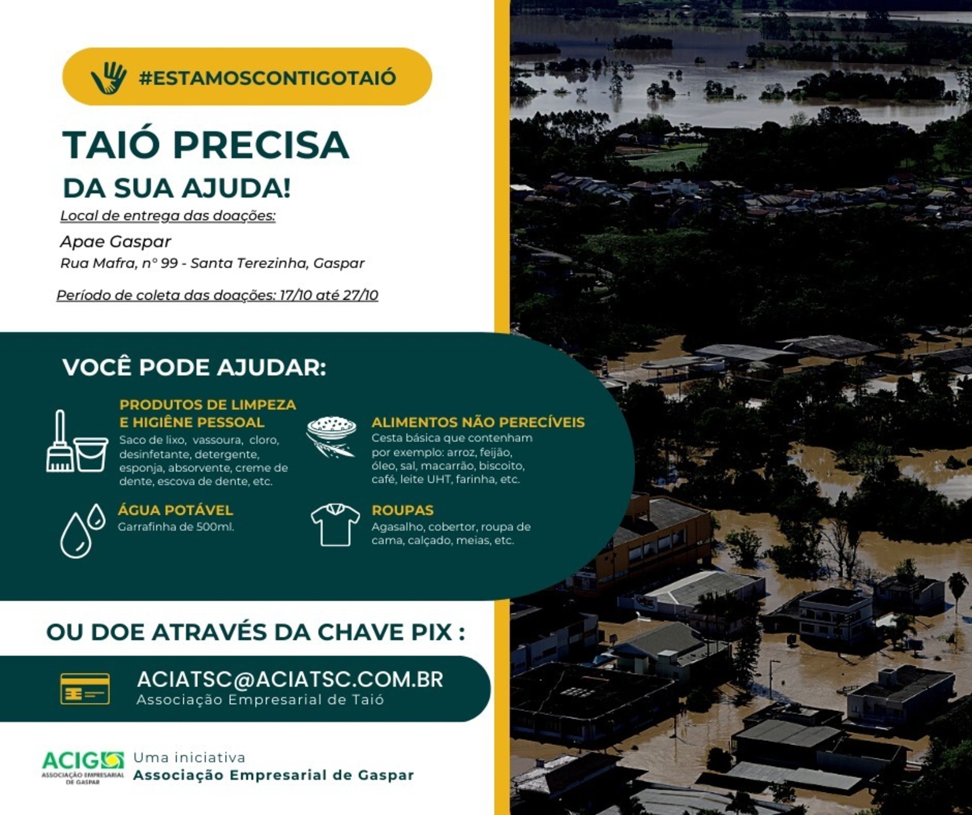 A Associação Empresarial de Gaspar (Acig) iniciou uma coleta de donativos para serem destinados aos atingidos pela enchente em Taió, no Alto Vale do Itajaí. As doações serão destinadas à Associação Empresarial da cidade, que fará a distribuição conforme a demanda. Os donativos serão recolhidos até o dia 27 de outubro.