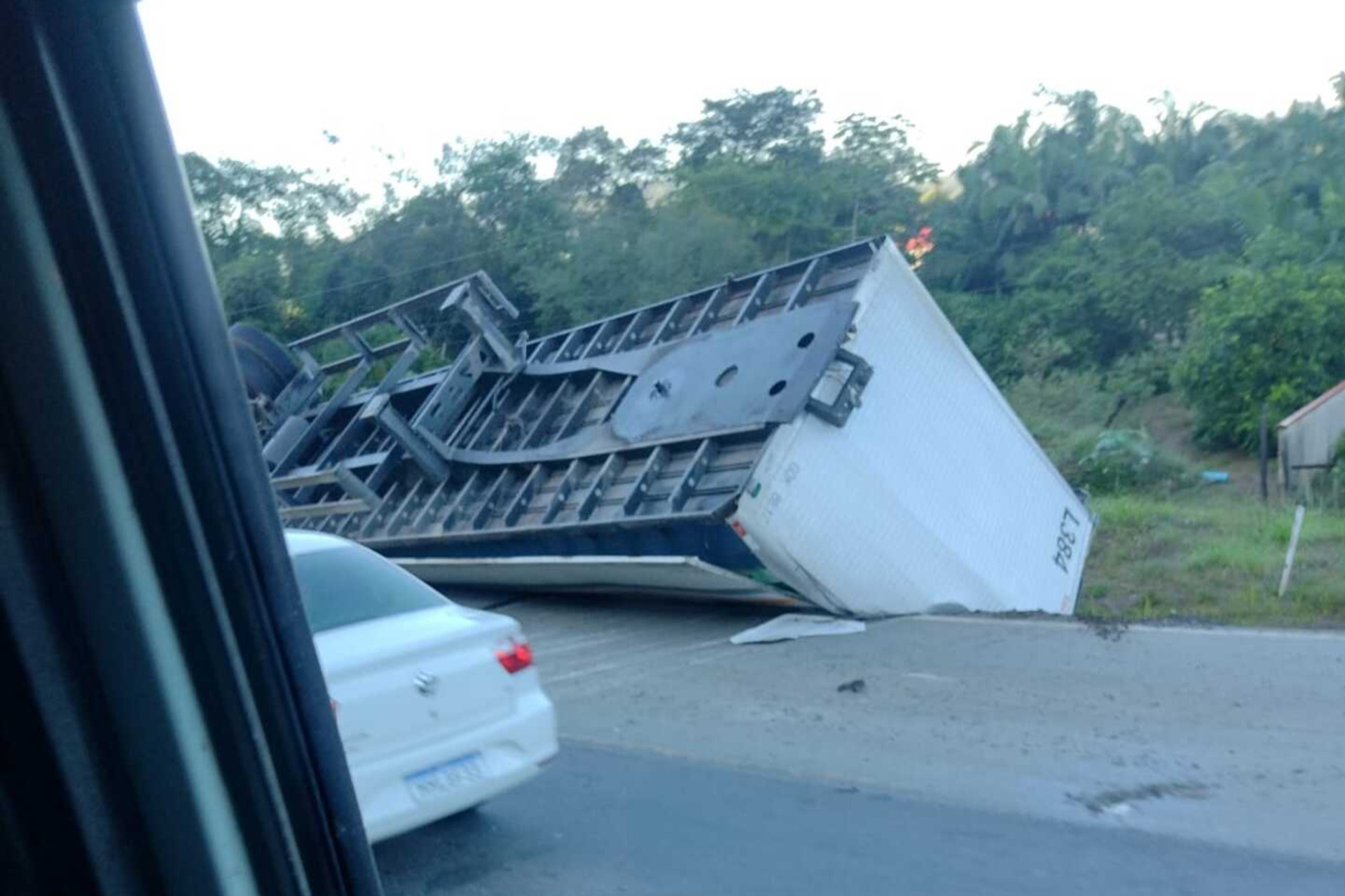 Na madrugada desta quarta-feira, dia 19, por volta de 1h45, um caminhão Mercedes Benz, placas de Brusque, saiu da pista e acabou tombando na altura no km 38,3 da BR-470, na região do Belchior Baixo, em Gaspar.