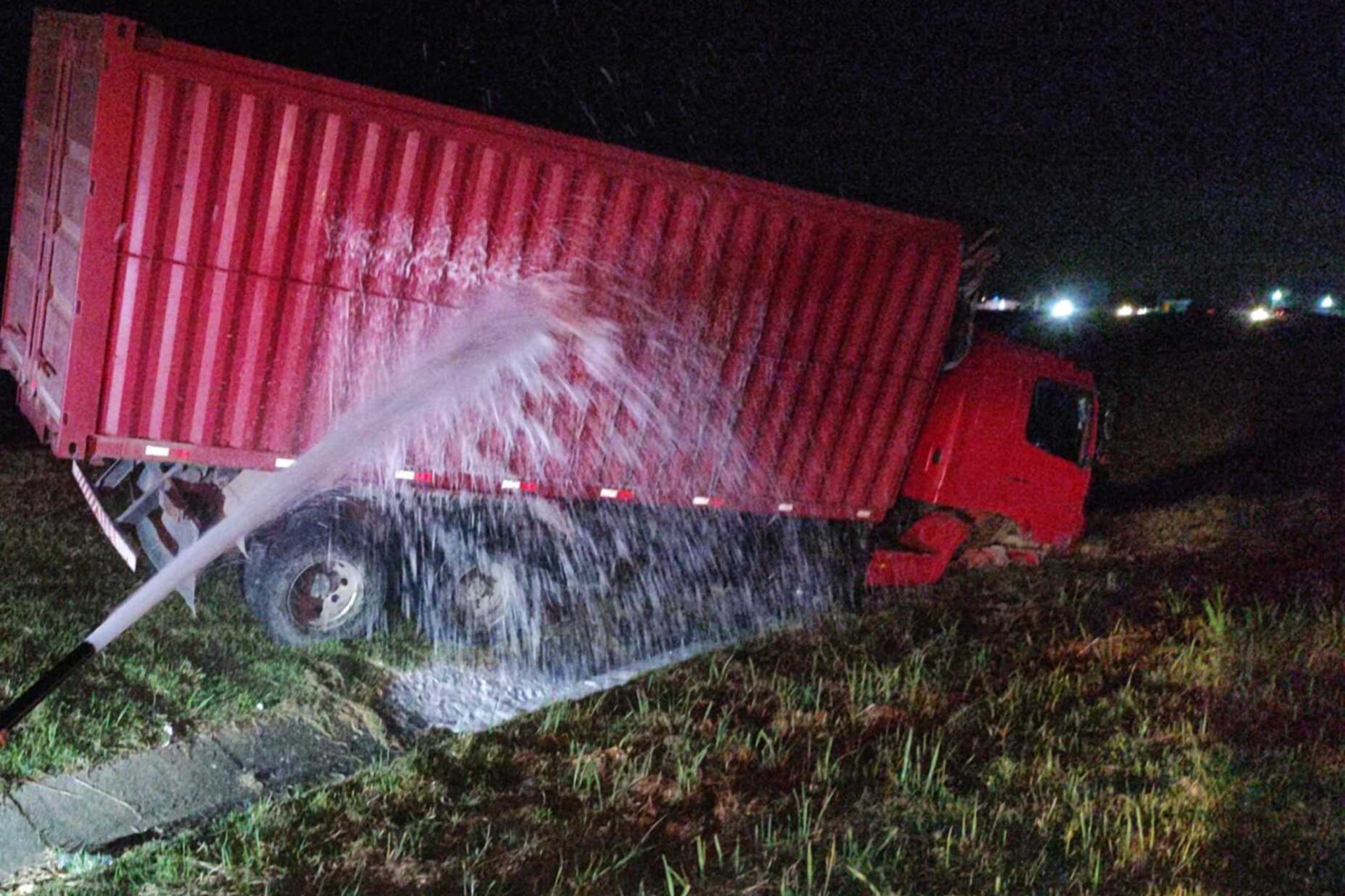 Durante o dimensionamento da ocorrência, os bombeiros identificaram um grande vazamento de combustível do tanque do caminhão. Assim, foi executado a ação preventiva ao incêndio, com uso de líquido gerador de espuma. A Polícia Rodoviária Federal (PRF) também esteve no local.