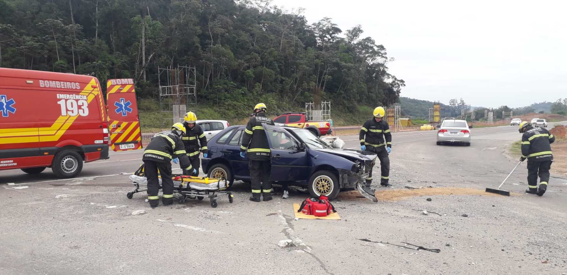 O primeiro veículo, um Volkswagen Gol, era conduzido por um homem de 44 anos. Ele estava consciente e orientado, mas encontrava-se sentado no banco do carona, referindo fortes dores no tórax e região da clavícula. Os sinais vitais estavam normais e, após o atendimento no local, o homem foi encaminhado ao Hospital de Gaspar para avaliação médica.