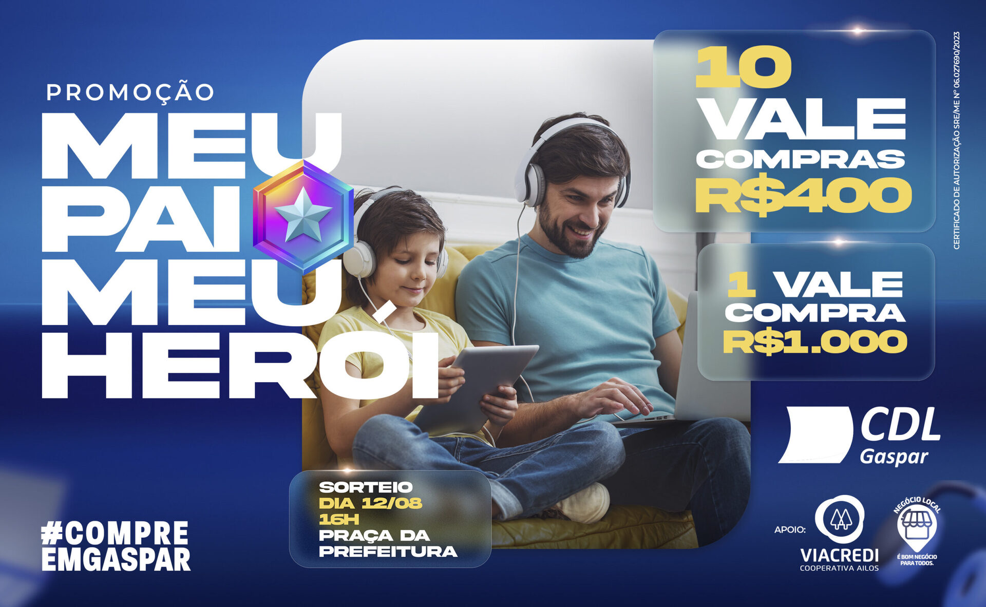Faltando pouco mais de um mês para o Dia dos Pais, que este ano será celebrado em 13 de agosto, a Câmara dos Dirigentes Lojistas (CDL) de Gaspar lançou a campanha "Meu Pai, Meu Herói", que vai sortear dez vale-compras no valor de R$ 400 e um de R$ 1 mil.