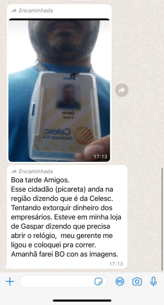 "Com relação às denúncias de tentativas de golpes registradas na região do Vale do Itajaí, cujos alvos são especialmente comerciantes e empresários, em que os criminosos se identificam como empregados da Celesc (com vestimentas similares à dos trabalhadores e identificados com crachás falsos) e ameaçam as vítimas com a suspensão do fornecimento de energia, a Celesc esclarece que suas equipes, em hipótese alguma, cobram serviços aos consumidores em campo. Além disso, todas as melhorias ou trabalhos realizado pela Companhia, a exceção dos emergenciais, são feitos após solicitação dos consumidores e por meio de agendamento prévio.
