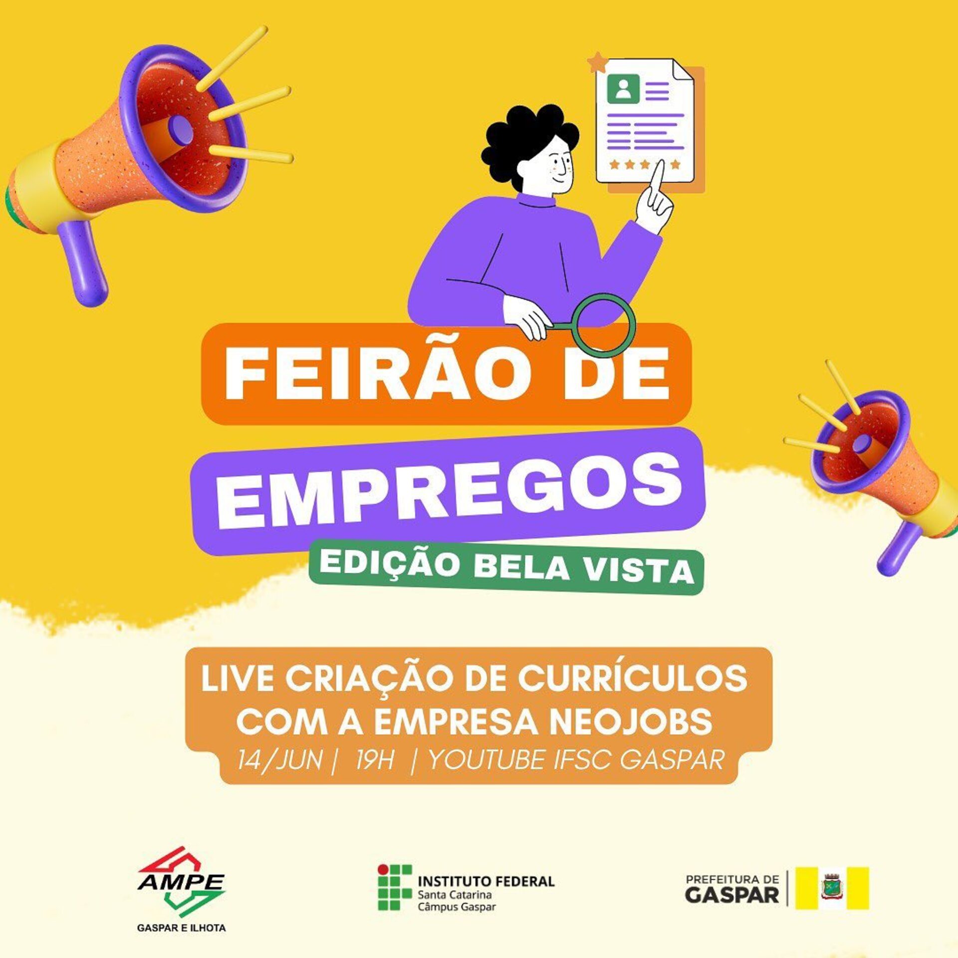 O Instituto Federal de Santa Catarina (IFSC) em parceria com a Prefeitura de Gaspar realiza nesta quarta-feira, dia 14, um evento especial para auxiliar a comunidade na busca de oportunidades de emprego. Como parte das atividades preparatórios para o Feirão de Empregos, o IFSC prepara uma live, em parceria com a empresa NeoJobs, com o tema “Como elaborar um currículo”, que será transmitida a partir das 19h, nos canais oficiais da instituição e da prefeitura.