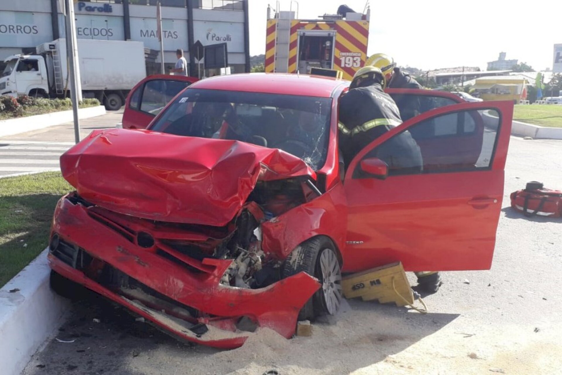 Ao chegar ao local do acidente, o Corpo de Bombeiros de Gaspar encontrou a condutora do veículo sentada no interior do automóvel, consciente e com sinais vitais estáveis, porém estava desorientada e apresentava contusão na clavícula e dores na pelve. Ela foi imobilizada, retirada do carro e conduzida ao Hospital de Gaspar. O motorista do caminhão, de 40 anos, não teve ferimentos.