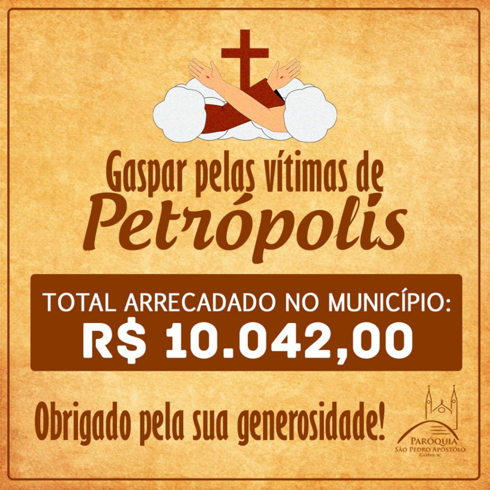 A Campanha solidária "Gaspar pelas vítimas de Petrópolis", que arrecadou dinheiro para as vítimas da tragédia que atingiu a cidade serrana do Rio de Janeiro no dia 15 de fevereiro, conseguiu arrecadar R$ 10.042,00. As doações puderam ser feitas até o dia 28 de fevereiro por meio de PIX ou transferência bancária. O valor será remetido ao Convento Franciscano do Sagrado Coração de Jesus em Petrópolis, para a sua justa distribuição. "Nós, Paróquia São Pedro Apóstolo e Fraternidade Franciscana São José, agradecemos a todos por mais este gesto de solidariedade e humanidade", disse a Paróquia em nota.