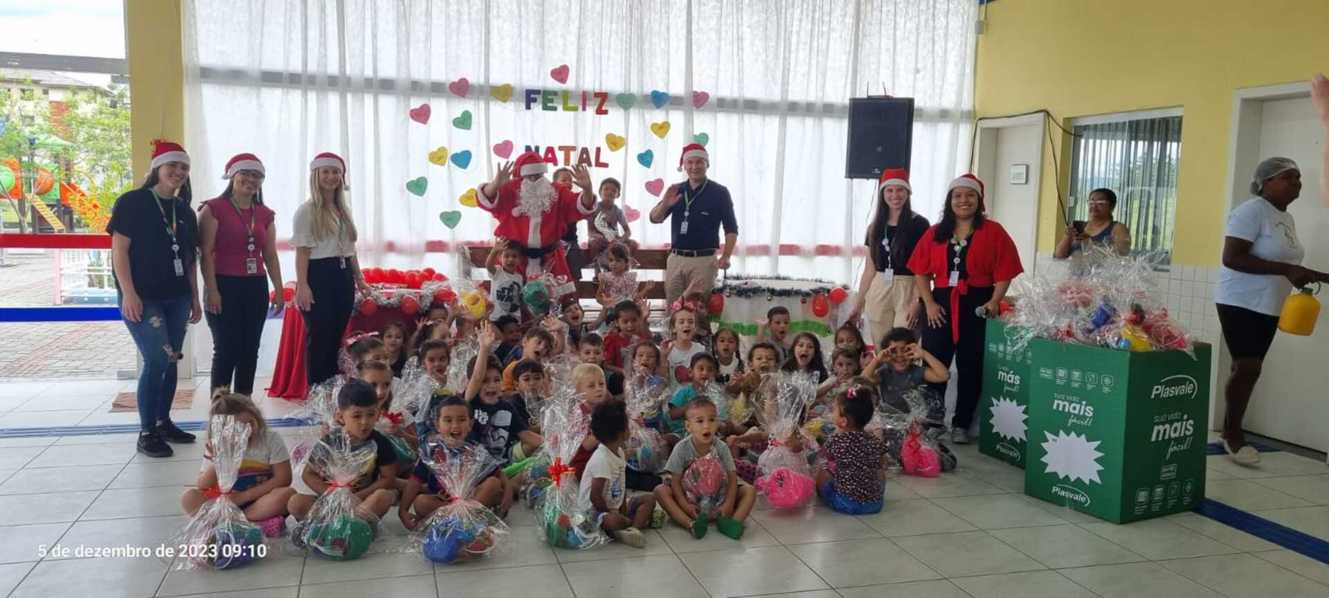 Pelo terceiro ano consecutivo a empresa gasparense Plasvale deixou o Natal de crianças do município ainda mais especial. Em uma ação interna de arrecadação de presentes promovida pela empresa e entre os funcionários, os nomes de cerca de 110 alunos que frequentam o CDI Maria Salete de Oliveira Pereira, no bairro Coloninha, foram colocados em uma árvore de Natal e os colaboradores puderam adotar uma criança e presenteá-la. A ação acontece todo ano em CDIs diferentes.