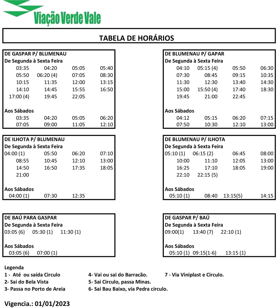 Bogo enviou também a tabela de horários da Verde Vale. De segunda a sexta-feira, a Verde Vale oferece, diariamente, 19 horários de Blumenau a Gaspar e vice-versa. Já de Blumenau para Ilhota são 14 horários. Há, ainda, uma linha que chega três vezes por dia ao Baú, em Ilhota. Confira abaixo.