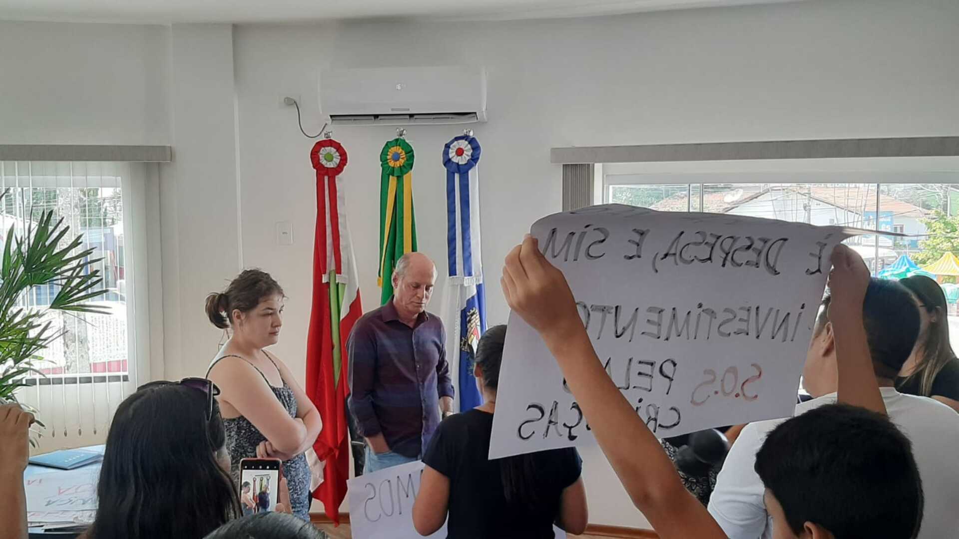 Hoje pela manhã, pais e mães acompanhados de seus filhos fizeram uma manifestação em frente à prefeitura, levantando faixas e pedindo ao prefeito Dida ações concretas para garantir a segurança das crianças nas escolas. O ato foi motivado pela recente tragédia em Blumenau, onde quatro crianças foram mortas.