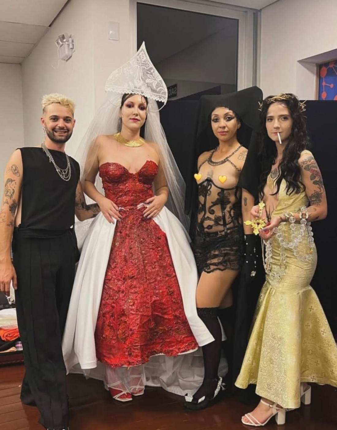 O estudante Juliano Michelli, que já foi seminarista, criou uma coleção que aborda o sagrado e o profano. Uma das peças é um vestido de noiva, em que além do branco tradicional, observa-se a presença do vermelho. Nessa peça, ele utilizou um tecido que criou feito com látex de seringueira oriundo de uma área de reflorestamento. O estudante utilizou o tecido em um vestido de noiva, tanto para dar um aspecto mais rígido para o algodão 100% lavável quanto para criar um material que remetesse ao aspecto da carne. “Foram três meses de pesquisa em que eu estudei formas de utilização do látex centrifugado que é usado, por exemplo, em fantasias de halloween ou em figurinos de filmes. O látex pode ser naturalmente tingido com colorau quando está líquido e depois eu coloquei um pouco de farinha de trigo para criar uma pasta e uso uma tinta de vidro para dar um aspecto mais brilhoso.”