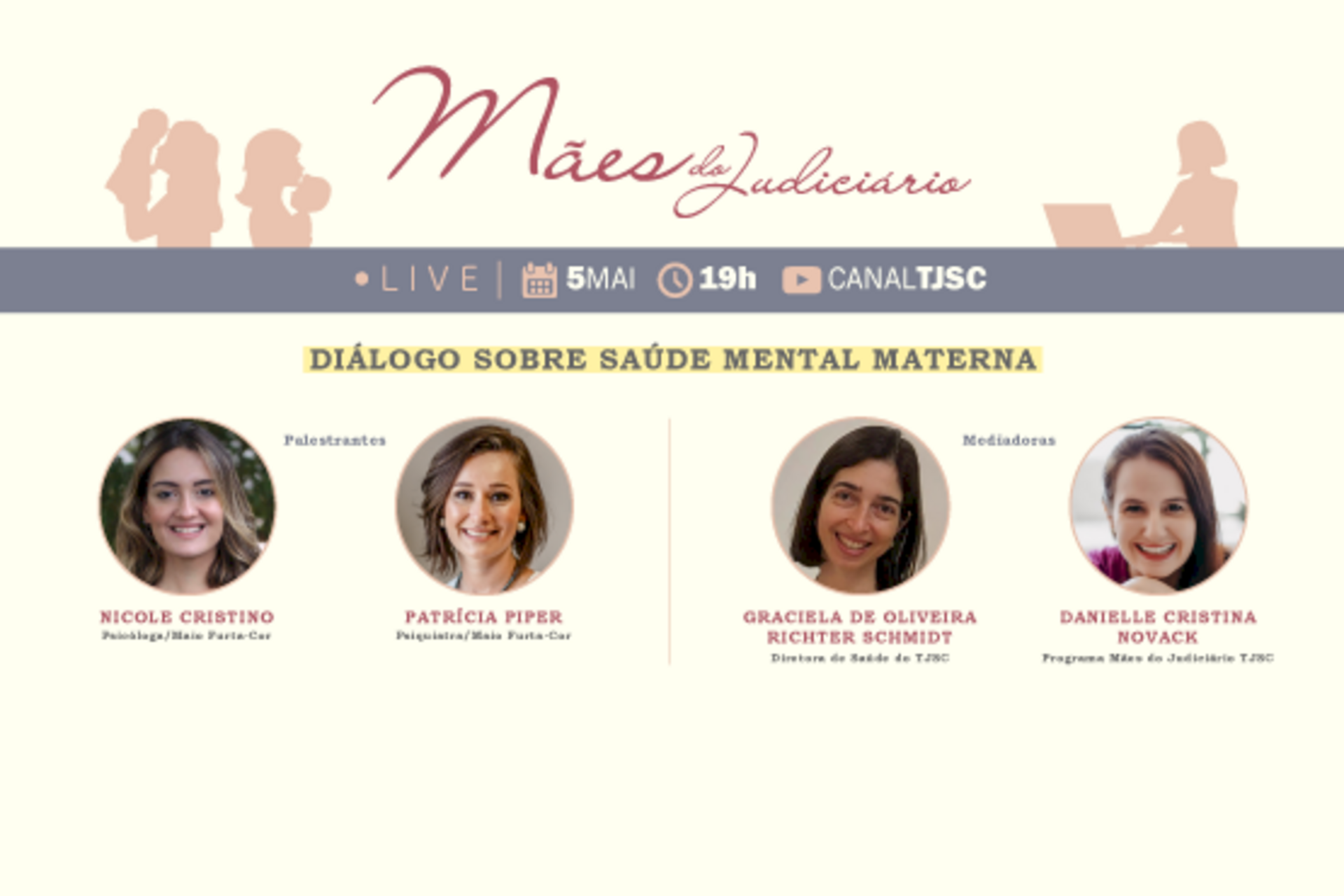 O programa Mães do Judiciário, vinculado à Diretoria de Gestão de Pessoas e à Diretoria de Saúde do TJSC, realizará uma live sobre saúde mental materna nesta quinta-feira (5/5), às 19h, com o apoio da Academia Judicial (AJ).