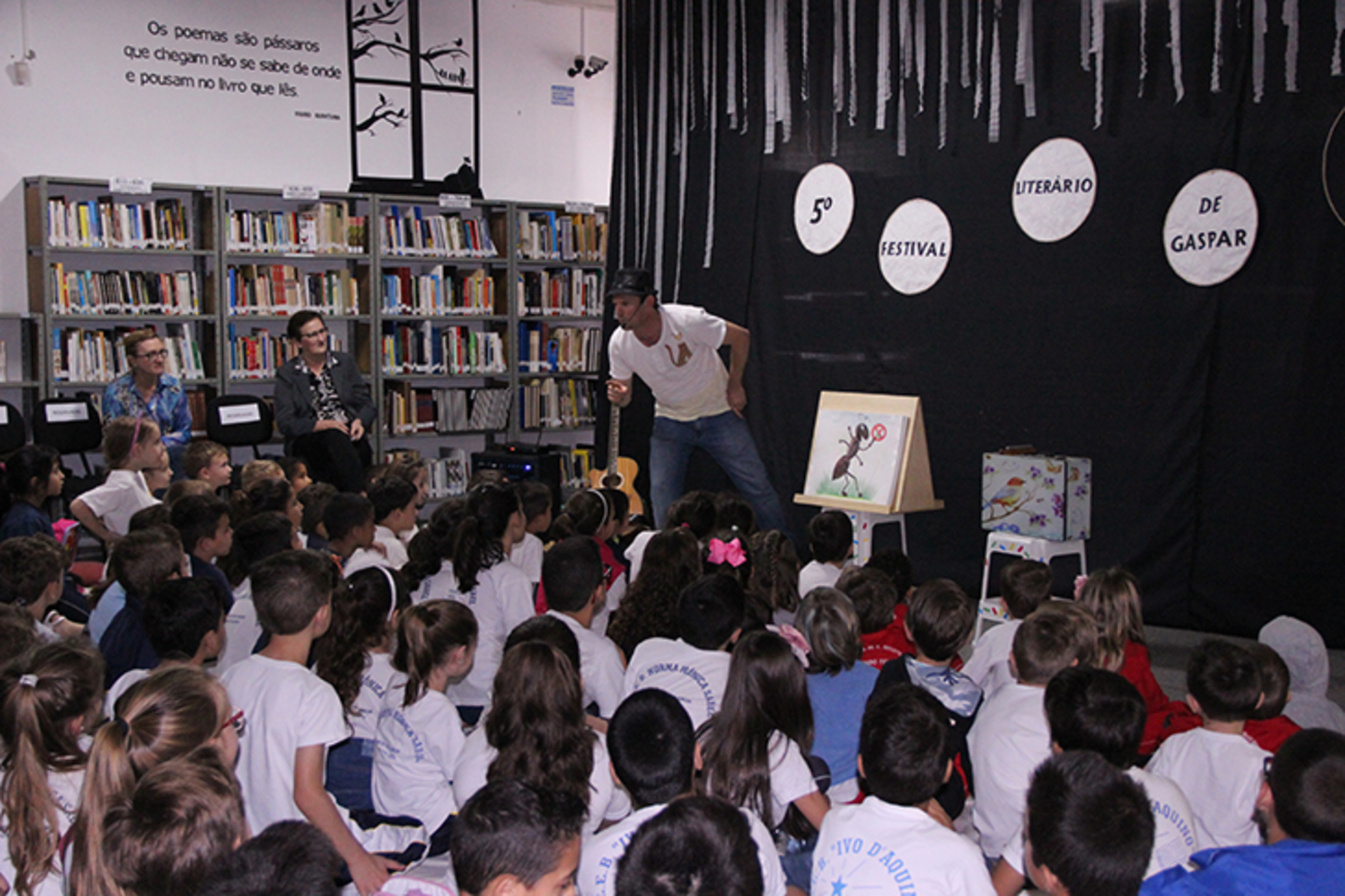 A Biblioteca Pública Municipal Dom Daniel Hostin, em Gaspar, ficou lotada na manhã de segunda-feira (23). Cerca de 300 crianças foram até o local para participar da abertura de mais um Festival Literário, que será realizado na cidade até o dia 10 de novembro. Contagiados pelo carisma de Emiliano de Souza, os pequenos ouviram com empolgação as histórias do espetáculo "Um, dois, três: Canto e conto com vocês"! E a biblioteca, assim como a Praça Getúlio Vargas e o auditória da prefeitura, prometem receber outros grandes públicos nas próximas atividades.