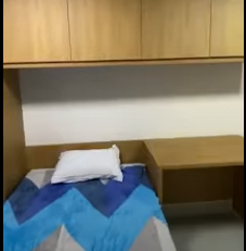 O espaço tem paredes brancas, uma cama de solteiro, armários, mesa de apoio, televisão, frigobar, ar condicionado e uma janela, além de banheiro privativo.
