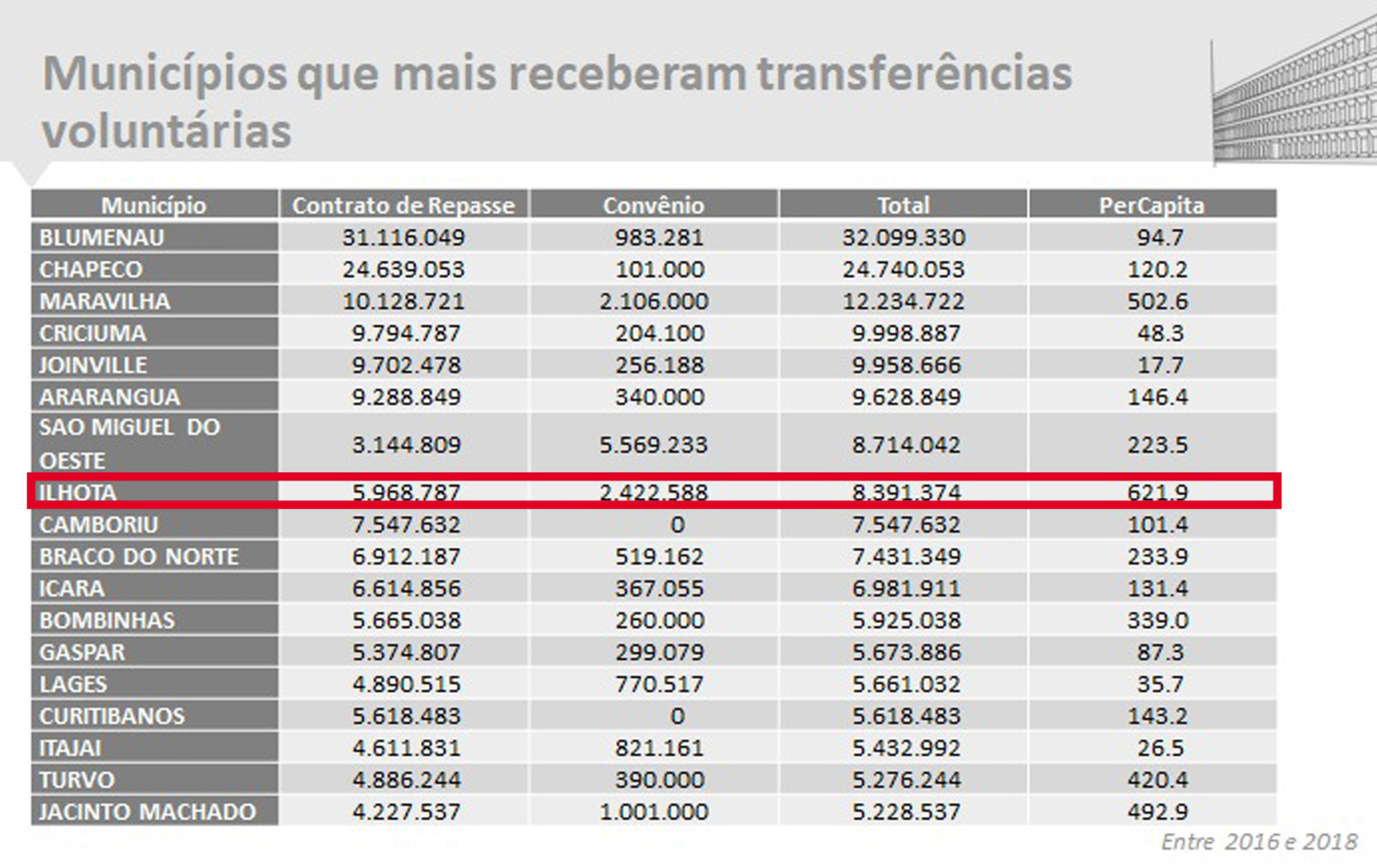 Relatório, divulgado recentemente pelo TCU (Tribunal de Contas da União) coloca Ilhota em 8º lugar no ranking de recebimento de transferências voluntárias entre todos os 295 municípios catarinenses. E mais: se o ranking levasse em conta a renda per capita por habitante, o município vizinho alcançaria a primeira colocação.