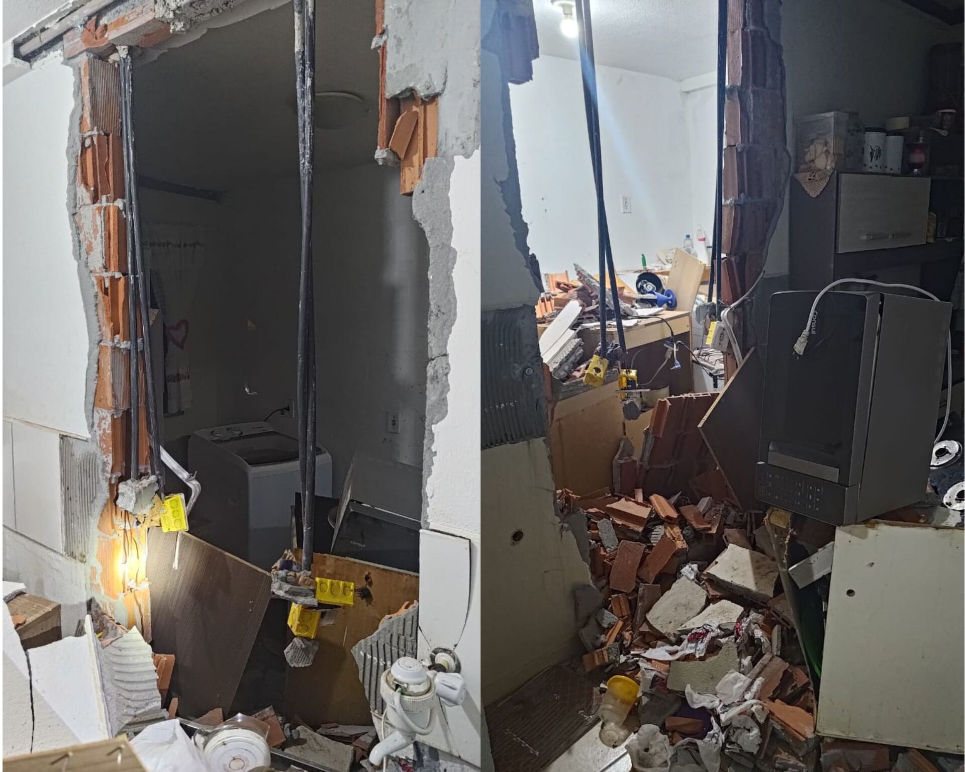 Uma explosão na rede de gás em um conjunto habitacional de Brusque abriu um buraco em uma parede que separa dois apartamentos e fez com que duas famílias precisassem deixar suas casas. A ocorrência foi registrada nesta segunda-feira, dia 20, por volta das 21h40, na rua Jacob Schmidt, bairro Águas Claras.