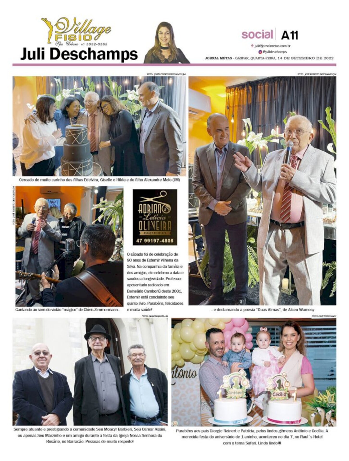 foto: José Roberto Deschamps/Jornal Metas/O sábado foi de celebração de 90 anos de Estemir Vilhena da Silva. Na companhia da família e dos amigos, ele celebrou a data e saudou a longevidade. Professor aposentado radicado em Balneário Camboriú deste 2001, Estemir está concluindo seu quinto livro. Parabéns, felicidades e muita saúde!