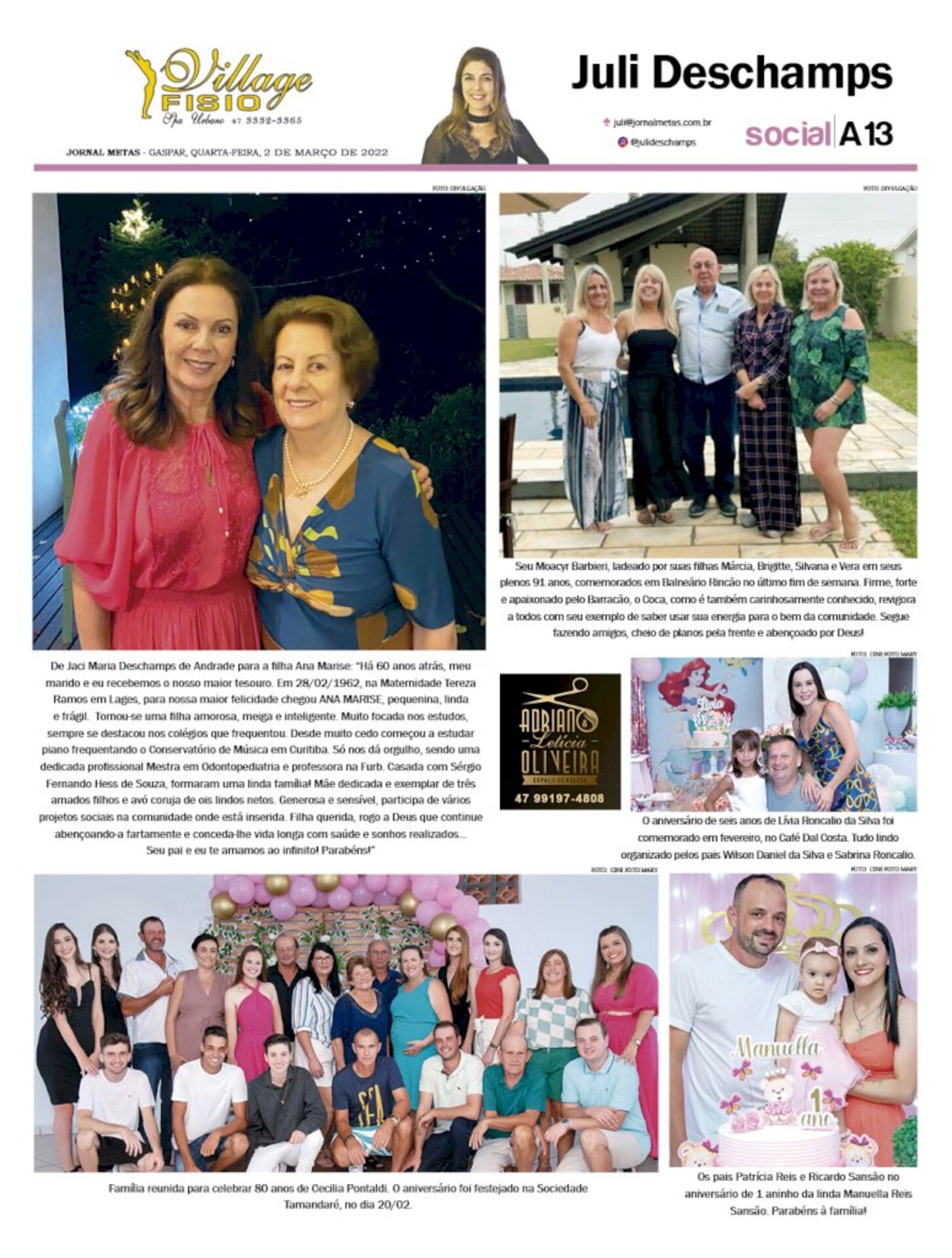 foto: Cine Foto Mary/De Jaci Maria Deschamps de Andrade para a filha Ana Marise: ?Há 60 anos atrás, meu marido e eu recebemos o nosso maior tesouro. Em 28/02/1962, na Maternidade Tereza Ramos em Lages, para nossa maior felicidade chegou ANA MARISE, pequenina, linda e frágil. Tornou-se uma filha amorosa, meiga e inteligente. Muito focada nos estudos, sempre se destacou nos colégios que frequentou. Desde muito cedo começou a estudar piano frequentando o Conservatório de Música em Curitiba. Só nos dá orgulho, sendo uma dedicada profissional Mestra em Odontopediatria e professora na Furb. Casada com Sérgio Fernando Hess de Souza, formaram uma linda família! Mãe dedicada e exemplar de três amados filhos e avó coruja de ois lindos netos. Generosa e sensível, participa de vários projetos sociais na comunidade onde está inserida. Filha querida, rogo a Deus que continue abençoando-a fartamente e conceda-lhe vida longa com saúde e sonhos realizados... Seu pai e eu te amamos ao infinito! Parabéns!?