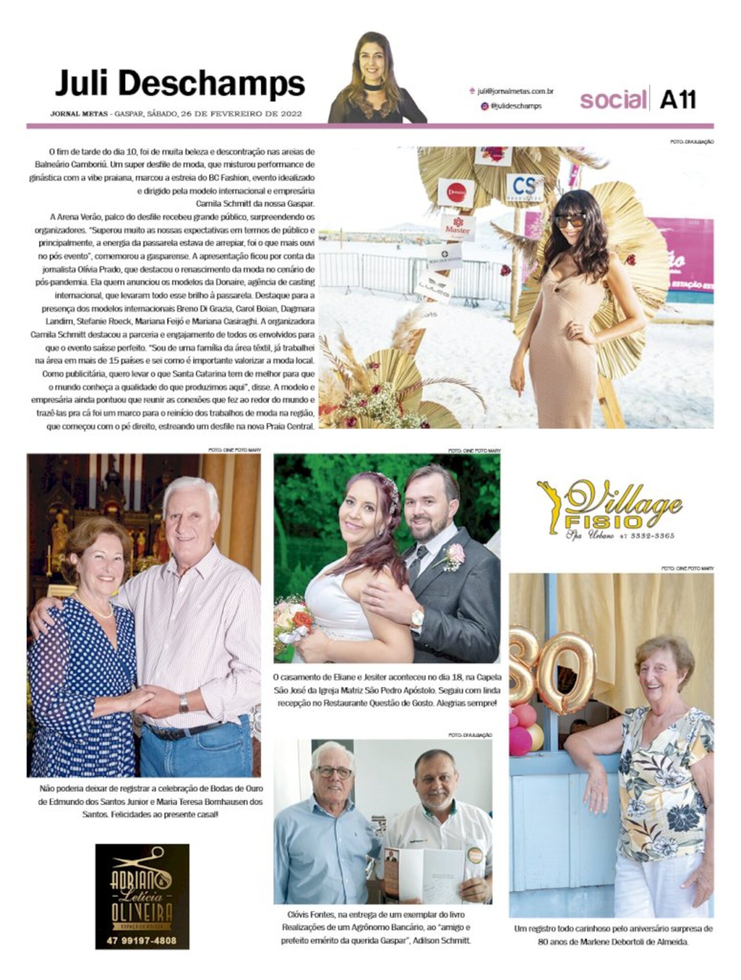 foto: Divulgação/O fim de tarde do dia 10, foi de muita beleza e descontração nas areias de Balneário Camboriú. Um super desfile de moda, que misturou performance de ginástica com a vibe praiana, marcou a estreia do BC Fashion, evento idealizado e dirigido pela modelo internacional e empresária Camila Schmitt da nossa Gaspar. A Arena Verão, palco do desfile recebeu grande público, surpreendendo os organizadores. ?Superou muito as nossas expectativas em termos de público e principalmente, a energia da passarela estava de arrepiar, foi o que mais ouvi no pós evento?, comemorou a gasparense. A apresentação ficou por conta da jornalista Olívia Prado, que destacou o renascimento da moda no cenário de pós-pandemia. Ela quem anunciou os modelos da Donaire, agência de casting internacional, que levaram todo esse brilho à passarela. Destaque para a presença dos modelos internacionais Breno Di Grazia, Carol Boian, Dagmara Landim, Stefanie Roeck, Mariana Feijó e Mariana Casiraghi. A organizadora Camila Schmitt destacou a parceria e engajamento de todos os envolvidos para que o evento saísse perfeito. ?Sou de uma família da área têxtil, já trabalhei na área em mais de 15 países e sei como é importante valorizar a moda local. Como publicitária, quero levar o que Santa Catarina tem de melhor para que o mundo conheça a qualidade do que produzimos aqui?, disse. A modelo e empresária ainda pontuou que reunir as conexões que fez ao redor do mundo e trazê-las pra cá foi um marco para o reinício dos trabalhos de moda na região, que começou com o pé direito, estreando um desfile na nova Praia Central.